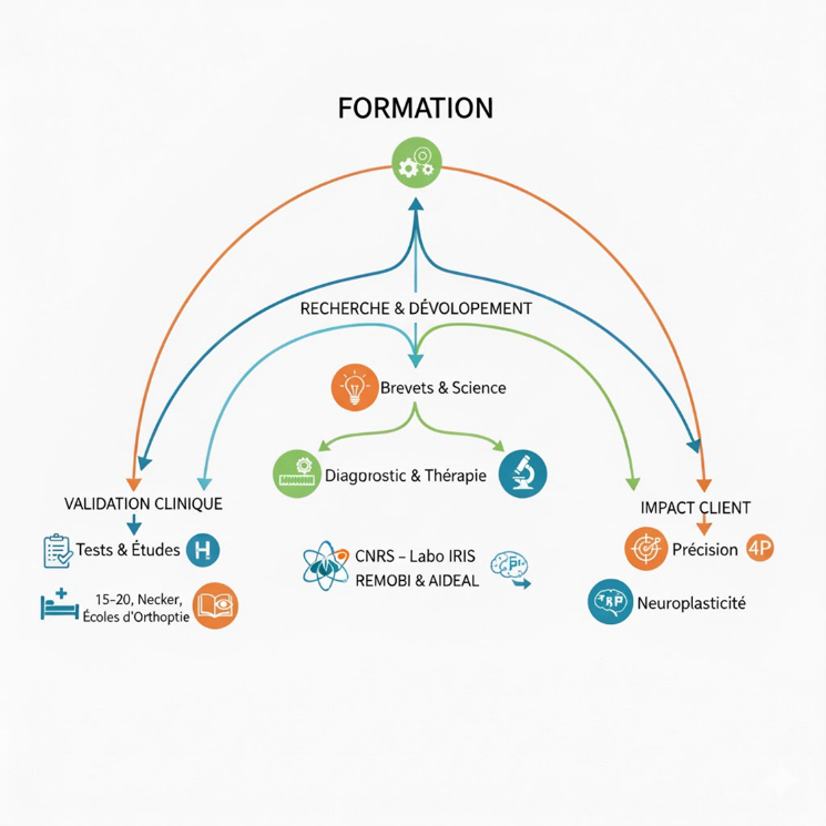 Validation Clinique : Partenariats constants avec les services d'ophtalmologie et d'orthoptie des plus grands hôpitaux parisiens (Quinze-Vingts, Saint-Antoine, Necker, Robert Debré, Pitié-Salpêtrière).