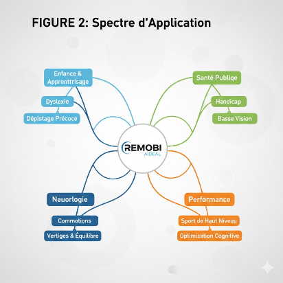 REMOBI & AIDEAL permet un dépistage précis, un diagnostic fonctionnel et une rééducation ciblée pour : 1. Troubles des Apprentissages : Amélioration significative de la lecture chez les enfants dyslexiques, dyspraxiques et TDAH. 2. Neurologie & Réadaptation : Prise en charge des AVC, traumatismes crâniens, commotions cérébrales, maladie de Parkinson, Alzheimer, SEP, autisme et paralysies cérébrales. 3. Équilibre & Vertiges : La seule technologie permettant d'évaluer et rééduquer la binocularité vestibulaire, cruciale pour les troubles centraux ou périphériques. 4. Performance Sportive : Protocoles OptiMax utilisés par les CREPS pour l'optimisation de la haute performance.